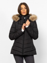 Dámská prošívaná bunda s ženskou siluetou, délka do pasu, vnitřní větrná léga, odnímatelná kapuce, odnímatelný kožíšek na kapuci, kapsy na zip, malé kovové logo na rukávech a kapuc