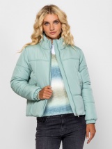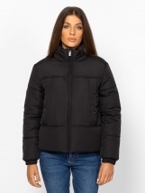 Dámská prošívaná bunda ve street stylu s boxovým střihem, délkou pod pas, vnitřním okrajem s úchopem, stojáčkem, gumovým zakončením rukávů, rovnými kapsami s patentovým zapínáním,