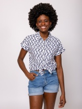 Dámská blůza s krátkým rukávem, rovný střih, pohodlný střih, vzorovaná tkanina, límec, zapínání na knoflíky, malé kovové logo. Materiál: 100% viskóza. Modelka měří 175 cm a má na s