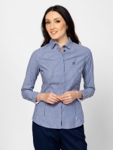 Dámská košilová halenka s úzkým střihem, dekorativním límečkem, skrytým zapínáním na knoflíky, manžetami na knoflíky, bavlněnou látkou s příměsí elastanu, elegantními vzory, vyšívaným logem na přední straně, malým kovovým logem na zadní straně. Materiál: 97% bavlna, 3% elastan, popelín. Modelka měří 175 cm a má na sobě velikost S.