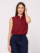 Dámská bezrukávová blůza s rovný střihem, pohodlný střih, vzorovaná tkanina, límec, zapínání na knoflíky, malé kovové logo na zadní straně. Materiál: 100% viskóza. Modelka měří 175