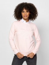 Dámská mikina s klasickým střihem, kulatým výstřihem, žebrovaným lemem na spodním okraji a vpředu, vysoký podíl bavlny, vyšívané logo na přední straně, malé kovové logo na zadní straně. Materiál: 58 % bavlna, 38 % polyester, 4 % elastan, uvnitř lehce česaný fleece. Modelka měří 175 cm a nosí velikost S.