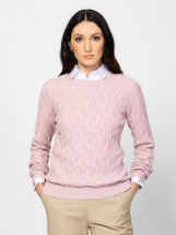 Dámský pletený svetr s krouceným vzorem, kulatým výstřihem, raglánovými rukávy, malým logem značky na spodní části vpředu. Materiál: 49 % viskóza, 28 % polyester, 23 % nylon, plete