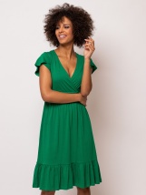 Dámské šaty se zavinovacím výstřihem a rukávy, s délkou pod kolena, s nařasením v pase a volánkem na spodku. Materiál: 50% bavlna, 50% modal, single jersey. Modelka je vysoká 175 c