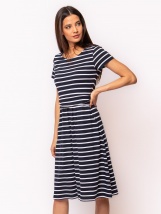 Proužkované dámské šaty s krátkým rukávem, s délkou pod kolena, se dvěma bočními kapsami. Sukňová část je mírně nařasená. Materiál: 50% bavlna, 50% modal, single jersey. Modelka je 175 cm vysoká a má na sobě velikost M.