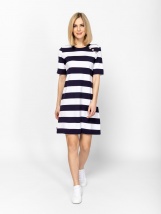 Dámské šaty s rovným střihem, kulatým výstřihem, délkou nad kolena, krátkými rukávy, vyrobené z pruhované látky, s dekorativními knoflíky na ramenou. Materiál: 63% viskóza, 32% nyl
