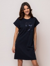 Dámské šaty s krátkými rukávy, rovného střihu s kulatým výstřihem, vpředu s velkým logem, s délkou pod kolena. Materiál: 55% bavlna, 45% modal, single jersey. Modelka je vysoká 175