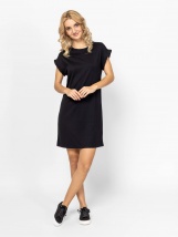 Dámské šaty, volnější střih, kulatý výstřih, délka nad kolena, spadlá ramena, nabírané rukávy. Materiál: 55 % bavlna, 45 % modal, single jersey. Modelka měří 175 cm a má na sobě ve