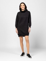 Dámské šaty s rolákem přes hlavu, širší střih, spadlá ramena, délka nad kolena, žebrovaný lem na spodním okraji a manžetách, vzor s logem, malé značení na spodní části vpředu. Mate