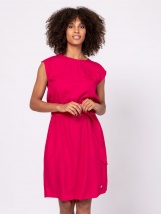 Dámské šaty s krátkým rukávem, kulatým výstřihem, délkou nad kolena, páskem, vzrušujícím vzorem. Materiál: 100% viskóza. Modelka měří 175 cm a má na sobě velikost S.
