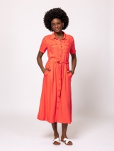 Dámské košilové šaty s krátkými rukávy, stylový design, dekorativní límec, přední kapsy, dlouhý střih, široký rozparek na sukni, pásek. Materiál: 100% viskózový twill. Modelka měří 175 cm a má na sobě velikost S.