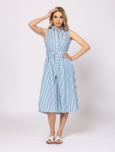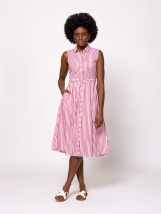 Dámské šaty bez rukávů s dekorativním límcem, dlouhý střih, široký rozparek na sukni, pásek, mírně štíhlý střih. Materiál: 100% bavlněný popelín. Modelka měří 175 cm a má na sobě v