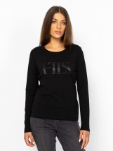 Dámské tričko s dlouhým rukávem, úzkým střihem, kulatým výstřihem, z bavlněné látky s příměsí elastanu, s tónovým potiskem a kamínky na přední straně, malým kovovým logem na zadní