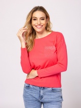 Dámské tričko s dlouhým rukávem, širším střihem a spadenými rameny. Má kulatý výstřih a spodní lem se stahováním pro ležérní vzhled. Vyrobeno z příjemné bavlněné směsi s modalem pro maximální pohodlí. Přední část zdobená třpytivými kamínky, na zádech malé kovové logo značky. Materiál: 50% bavlna, 50% modal, single žerzej. Modelka měří 175 cm a má na sobě velikost S.