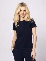 Dámské tričko s krátkým rukávem, mírně přiléhavého střihu, s kulatým výstřihem, vyrobené z bavlněné látky s příměsí elastanu a malým tištěným logem značky na přední straně. Materiál: 95 % bavlna, 5 % elastan, single jersey. Modelka měří 175 cm a nosí velikost S.