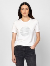 Dámské tričko s krátkým rukávem, rovný střih, kulatý výstřih, přední část zdobená kamínky a malý kovový branding na zádech. Materiál: 50 % bavlna, 50 % modal, single jersey. Modelka měří 175 cm a nosí velikost S.
