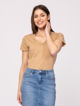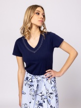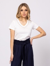 Dámské tričko s krátkým rukávem, mírně přiléhavého střihu, vyrobené z pohodlné bavlněno-modalové směsi, s V-výstřihem ozdobeným kamínky a malým kovovým logem na spodní straně, v kl