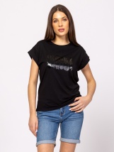 Dámské tričko s krátkými rukávy rovného střihu, se spadlými rameny, klopovými rukávy, z čisté bavlněné tkaniny, s vytištěným logem značky na přední straně. Materiál: 100% bavlna, j