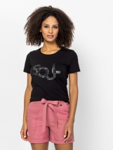 Dámské tričko s krátkým rukávem, úzkým střihem a kulatým výstřihem, s potiskem na přední straně. Materiál: 95% bavlna, 5% elastan, single jersey. Modelka měří 175 cm a nosí velikost S.