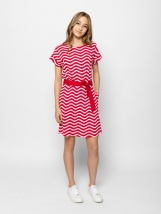 Dívčí šaty s volnějším střihem, kulatým výstřihem, délkou nad kolena, spadlými rameny, vyrobené z látky s pruhovaným vzorem. Materiál: 50% bavlna, 50% viskóza, jednolícní úplet.