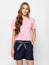 Dívčí tričko s krátkým rukávem, volný střih, s kulatým výstřihem a spadlými rameny, velké tištěné logo značky na přední straně. Materiál: 50% bavlna, 50% modal, single jersey.