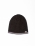 Pánská pletená čepice s žebrovaným vzorem, v základních barvách, s pruhy na spodní části a malým kovovým logem značky na boku. Materiál: 100% akryl.