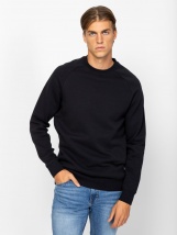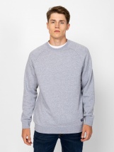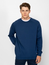 Pánský svetr s kulatým výstřihem a sportovním střihem, žebrovanými manžetami a lemem, a malým tkaným štítkem značky na spodní části vpředu. Materiál: 80% bavlna, 20% polyester, uvnitř česaný fleece. Model měří 188 cm a nosí velikost L.