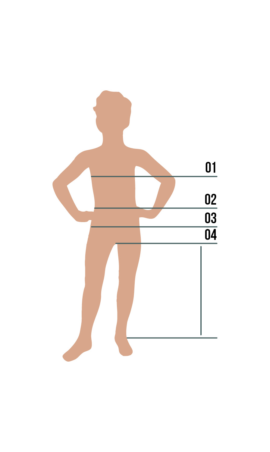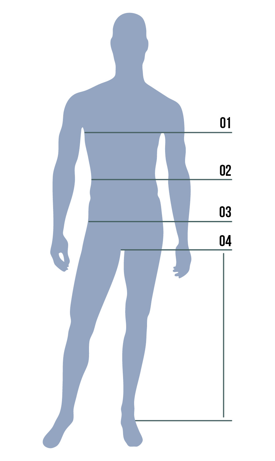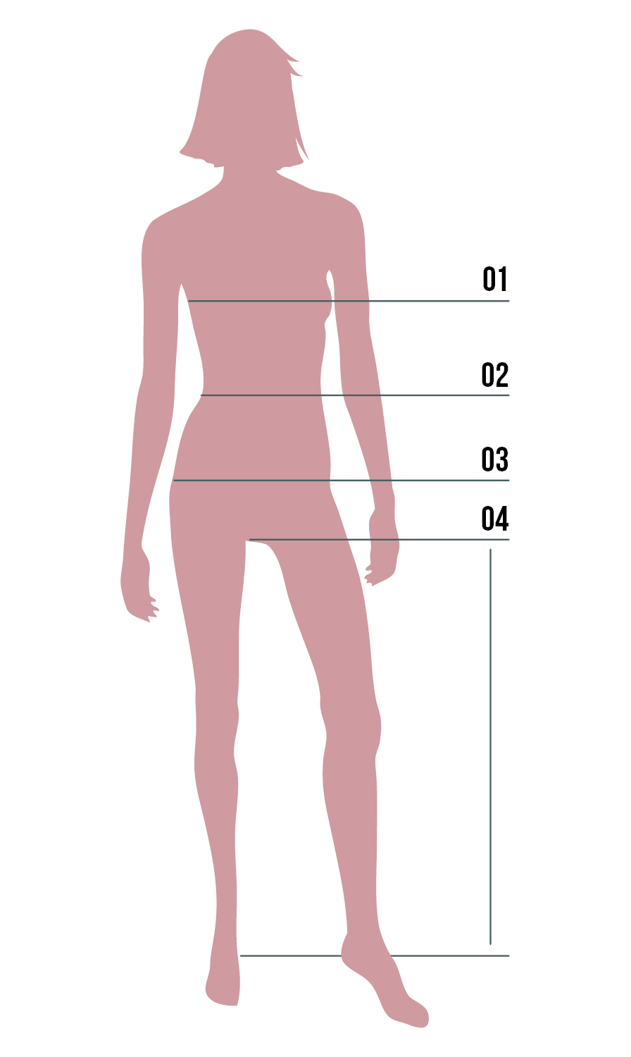 1. Obvod hrudníku Měřicí pásku ve vodorovné poloze přilož v nejširším místě hrudníku (obvykle ve výšce bradavek) a změř obvod při výdechu. 2. Obvod pasu Změř obvod v nejužším místě pasu (obvykle nad pupkem, pod žebry) v přirozené poloze, bez zatahování břicha. 3. Obvod boků Měřit v nejširším místě hýždí, měřicí páskou vedenou vodorovně kolem obvodu. Pro přesný výsledek je vhodné provádět měření v spodním prádle, se sevřenýma nohama, přičemž je třeba dbát na to, aby páska nezařezávala do kůže, ale ani nevisela volně. |