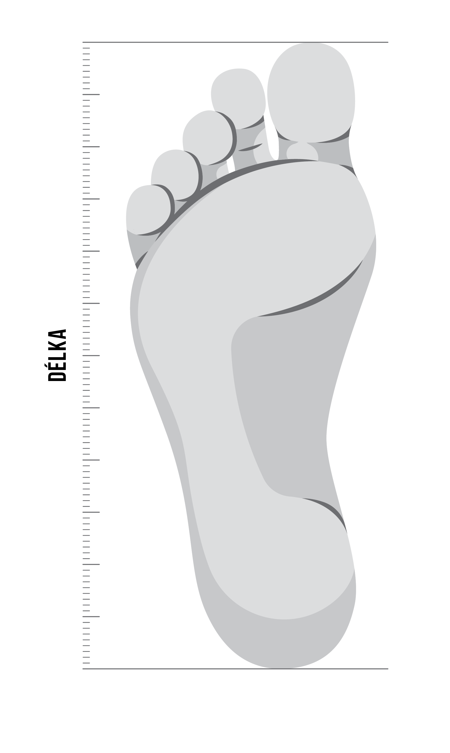 • Jak změřit?: Postav se na list papíru a přitiskni patu ke zdi. Označ si špičku svého nejdelšího prstu a poté změř vzdálenost mezi zdí a touto značkou v milimetrech. • Kdy měřit?: Na konci dne může tvoje noha trochu oteknout, proto je pro co nejpřesnější výsledek vhodné měřit odpoledne nebo večer. • Použití ponožek: Měř si nohu v ponožkách stejné tloušťky, v jakých plánuješ boty nosit. • „Přídavek“ (tolerance): Doporučujeme k naměřené délce nohy přidat přibližně 0,5–0,7 cm, aby byl dostatek místa pro prsty. • Mezi dvěma velikostmi?: Pokud se nacházíš mezi dvěma velikostmi, vyber si pro větší pohodlí tu větší. |
